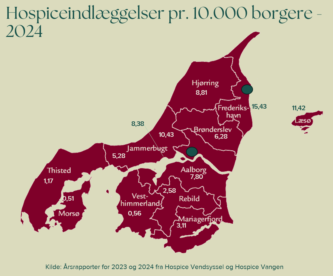 Hvis vi stiller 10.000 borgere fra hver kommune op side om side, vil 0,51 fra Mors komme på Hospice. Fra Thisted 1,17. I den vestlige del af Jammerbugt 5,28. Til sammenligning fik 7,80 borgere i Aalborg, 8,81 i Hjørring og 14,80 borgere i Frederikshavn adgang til hospice i 2024.